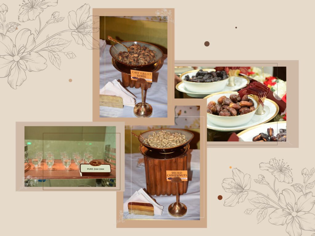 Zam Zam water is a special type of water that is considered sacred by many Muslims and is often served at religious events, including weddings. It is believed to have special healing properties and is sourced from a well in Mecca, Saudi Arabia. Religious Significance: