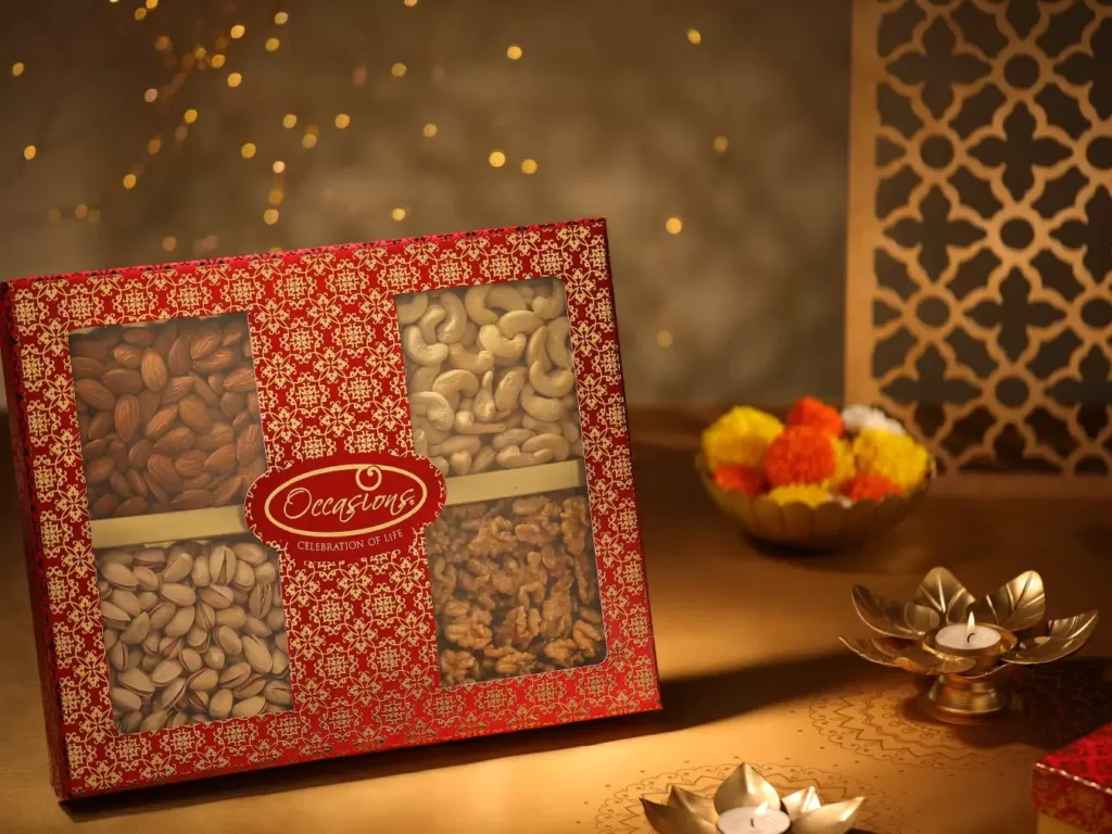 If you’re looking for top-notch dry fruits, look no further than Occasions. Our Nuts Galore Jar Box is perfect for those fasting during Navratri. It comes with four jars of premium dry fruits, including crunchy almonds and buttery cashews. It’s more than just a box of dry fruits; it’s a way to make your fasting period more enjoyable and fulfilling.