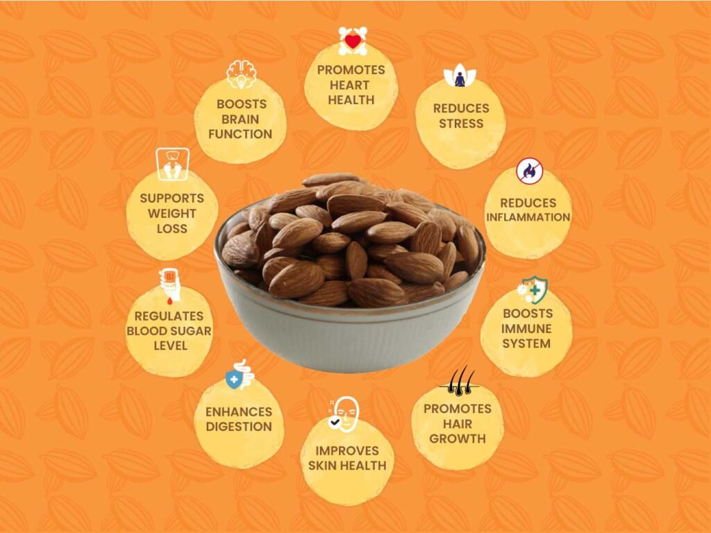 - Promotes Heart Health: Almonds are a good source of healthy fats and antioxidants that can improve heart health and lower the risk of heart disease. They can also help lower bad cholesterol levels and reduce blood pressure.